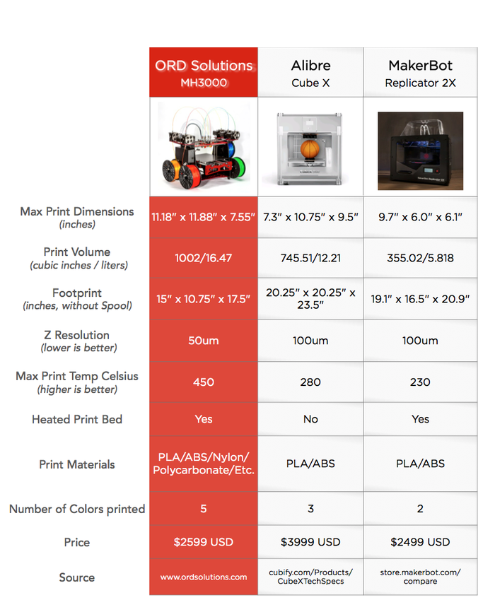 2013年10月,一個名為ORD Solutions的公司推出了一款名為MH3000的5色3D打印機,這款打印機有5個噴嘴,可打印5種不同的顏色或材料。該公司用這款產品成功地在Kickstarter上進行了眾籌,募集了11萬多加元的資金。