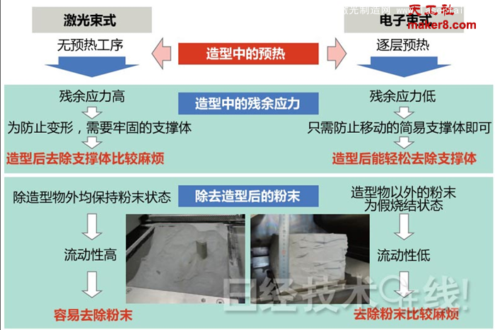 激光束式不實施預熱,電子束式實施預熱。由此,殘余應力的大小和造型物以外的粉末狀態(tài)會發(fā)生變化,造型后的工序各有利弊。
