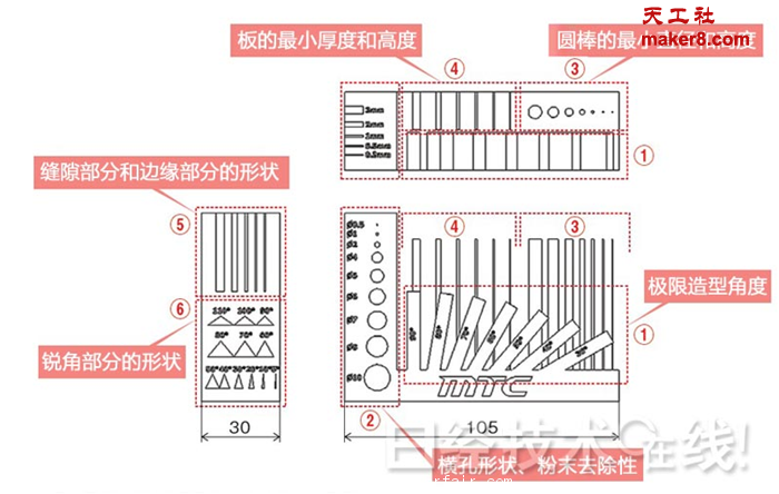 為調查粉末去除性等會對實際造型物的精度和形狀再現(xiàn)性產生什么影響,研究機構用這兩種方式的3D打印機打印了Ti-6Al-4V的造型樣品并進行了比較(圖2)。為確認以下六點,專門設計了樣品。這六點包括:(1)如果沒有支撐體,造型時的最大倒塌角度是的多大(極限造型角度)、(2)能再現(xiàn)多小的橫孔(橫孔形狀、粉末去除性)、(3)圓棒的最小直徑和高度、(4)板的最薄厚度和高度、(5)縫隙部分和邊緣部分的形狀、(6)銳角部分的形狀。