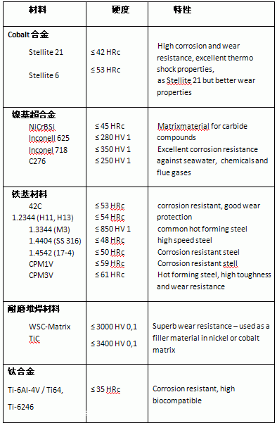 目前,利用激光熔覆技術可以制備鐵基、鎳基、鈷基、鋁基、鈦基、鎂基等金屬基復合材料。從功能上分類:可以制備單一或同時兼備多種功能的涂層如:耐磨損、耐腐蝕、耐高溫等以及特殊的功能性涂層。從構成涂層的材料體系看,從二元合金體系發展到多元體系。多元體系的合金成分設計以及多功能性是今后激光熔覆制備新材料的重要發展方向。常見的激光熔覆材料見下表: