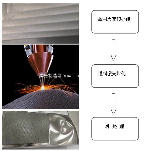 同步送粉式激光熔覆的主要工藝流程為:基材表面預處理---送料激光熔化---后處理,如下圖示: