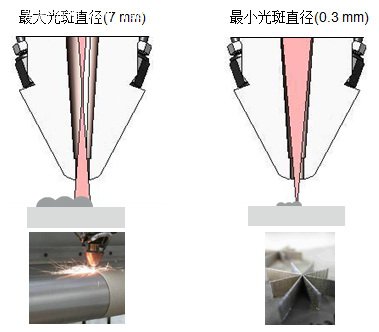 通快提供承受最大4KW激光的同軸送粉頭和承受10KW激光的旁軸送粉頭。值得一提的是通快提供的融覆加工頭具有光斑直徑能夠在0.3mm ~7mm實時可調功能。這樣進行加工時就能通過編程調節激光光斑直徑,既能保證激光熔覆很高的加工精度,又能保證很高的融覆效率。