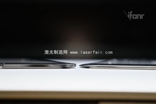 和手上的iPhone 5面板對比下發現,雖然差別不大,但發現這塊新玻璃面板比之前的產品更薄了。而且這塊玻璃的設計也與之前的產品有很大不同,邊緣采用了弧面打磨工藝,因此正面看上去會出現一定的弧面效果,這種工藝與諾基亞的2.5D玻璃面板工藝非常相似。