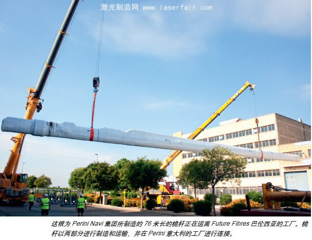該76 米長(zhǎng)的桅桿經(jīng)過了18 個(gè)月的設(shè)計(jì)、開發(fā)和建造,于2013 年的9 月最后完成,是為一艘Perini Navi 集團(tuán)60米長(zhǎng)的單桅帆船生產(chǎn)的。Future Fibres公司還將為這艘船只提供卷帆桿以及專門定制的整套復(fù)合材料索具。