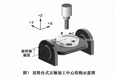 機(jī)床運(yùn)動(dòng)學(xué)求解,主要包括轉(zhuǎn)動(dòng)軸轉(zhuǎn)動(dòng)角度計(jì)算和經(jīng)過(guò)轉(zhuǎn)動(dòng)后的3個(gè)移動(dòng)坐標(biāo)X、Y、Z 值的求解。對(duì)于不同類(lèi)型運(yùn)動(dòng)關(guān)系的數(shù)控機(jī)床, 運(yùn)動(dòng)學(xué)求解算法是不同的。下面以較復(fù)雜的雙轉(zhuǎn)臺(tái)式五軸數(shù)控機(jī)床(圖1)為例來(lái)討論后置處理坐標(biāo)轉(zhuǎn)換及回轉(zhuǎn)角度計(jì)算方法。