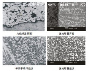 圖2是激光再制造技術與傳統再制造技術材料基體界面和熔覆層金相組織對比。可以看出,火焰噴涂內存在氣孔缺陷,界面屬于機械結合。激光熔覆層存在一條白亮界面,屬于冶金結合。等離子噴焊層組織粗大,高硬度的大塊的碳化物易是涂層產生脆性。激光熔覆層組織細小,高硬度的大塊的碳化物已被激光熔凝成細小的碳化物,均勻分布在涂層基底上,從而使激光熔覆層不僅具有高硬度高耐磨性,而且具有很高的韌性。