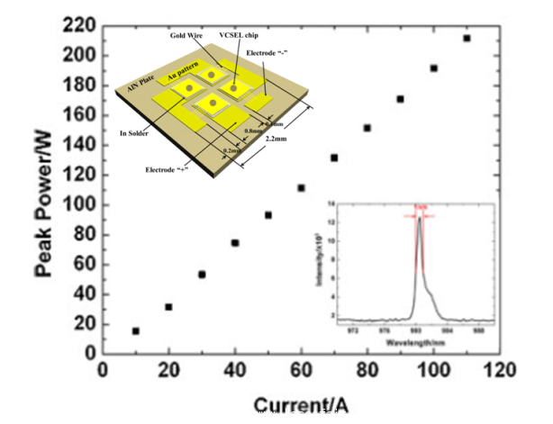 中國科學院長春光學精密機械與物理研究所大功率激光研究組開發出了利用4個高功率垂直腔面發射半導體激光器(VCSEL)單管串接形成的百瓦級980nm波段高功率準列陣模塊。該模塊采用全自主化設計的芯片結構及模塊結構,模塊尺寸僅有2.2mmX2.2mm,輸出功率高達210W,這是單管VCSEL模塊迄今為止所報道的最高功率指標。該突破使得微小型高功率VCSEL模塊有望在激光引信、激光測距及激光面陣雷達系統中實現實用化。
