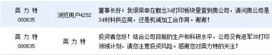 英力特(9.30, 0.10, 1.09%)(000635)周四上午在全景網(wǎng)互動(dòng)平臺(tái)向投資者坦言,結(jié)合其目前的生產(chǎn)和科研水平,公司沒有進(jìn)軍3D打印領(lǐng)域計(jì)劃。英力特的主營業(yè)務(wù)為聚氯乙烯、燒堿的生產(chǎn)與銷售。