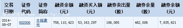 大族激光(002008)2014年8月7日融資融券信息顯示,大族激光融資余額756,110,423元,融資買入額53,163,297元,融券賣出量186,065股,融券余量462,006股,融券余額7,835,62...