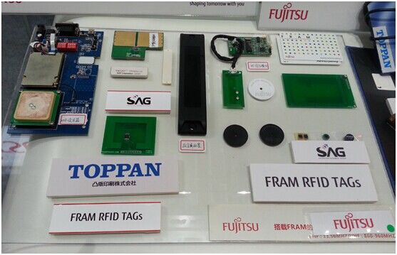 如上圖所示為富士通半導體展臺現場展示的搭載FRAM的RFID芯片,此類電子標簽具有大容量存儲(UHF容量分別為36bytes、4Kbytes;HF容量分別為256bytes 、2Kbytes、9Kbytes)、高速寫入、高耐久性(靜態功耗小于1uA)、耐放射線性、嵌入式RF(具有SPI串口,可實現與微處理器的連接)的特點。