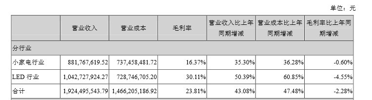 報告期內,公司的主營業務仍為小家電和LED雙主業。受益于LED行業良好的增長勢頭以及公司LED產能的釋放,上半年,公司LED行業實現營業收入10.43億元,比上年同期增長50.39%。但是,隨著LED行業競爭的加劇,LED產品銷售價格有所下降,以及公司產品結構發生變化,導致整體毛利率下滑至30.11%,同比下降4.55%。
