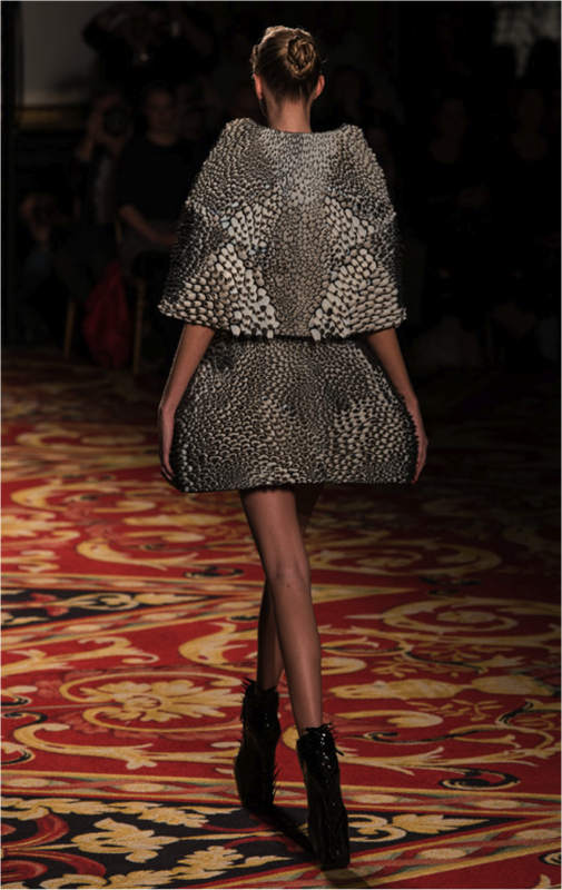圖三:這條黑色斗篷裙是設計師和Stratasys 及領導MIT的Media Lab的美國設計師 Neri Oxman共同合作完成的。Stratasys公司采用了多材料3D打印技術來滿足裙子和斗篷中對軟硬質材料的不同需求。Oxman教授說:“3D打印技術能隨時調整材料軟硬度和彈性的優點啟發了我們去為身體設計一款類似活動的鎧甲一般的“第二層肌膚”。”