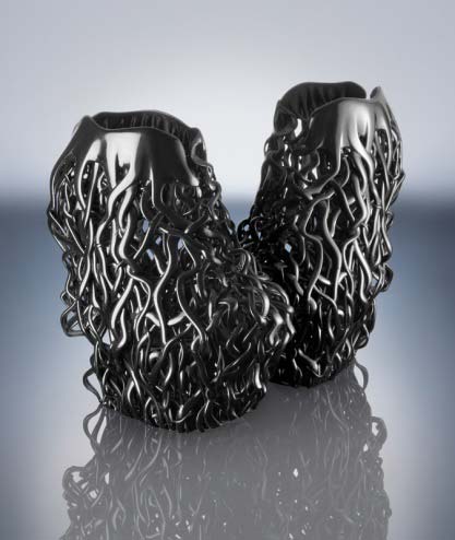 圖一:這條黑色短裙獨特復雜的蕾絲狀紋理必須采用Mammoth立體技術光固化技術(Mammoth Stereolithography machines)制作。參與設計的建筑師(沒錯,真是建筑師)Koerner說:“對計算機、3D打印以及新材料相結合的探索,給服裝帶來了新的吸引力和神秘感,也給時裝界帶來了無縫成衣的諸多可能性。”