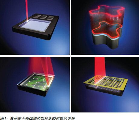 激光聚合物焊接是一種無振動、非接觸且非常精確的焊接塑料部件的方式。如今,激光透射焊接有四種較為成熟的方法(圖1)。在輪廓焊接中,一束激光投射到待焊接工件上,接著激光束沿著待焊接區(qū)域的輪廓掃描一周,兩個夾緊的塑料部件上被掃描的區(qū)域由此被融化并連接在一起。在準同步焊接中,兩個掃描鏡以非常高的速度沿著輪廓多次偏轉(zhuǎn)激光光斑。在這種方法中,整個圖案的加熱和連接幾乎是同步完成的。在同步焊接中,完全相同形狀的圖案輪廓被激光光束融化并同時連接。在掩膜焊接中,線狀的激光束穿過反射掩膜,掩膜的陰影區(qū)下方是不需要連接的區(qū)域。