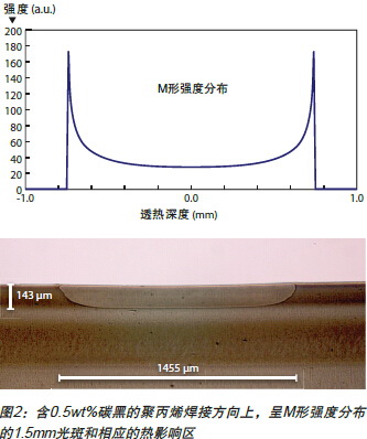 對輪廓焊接和準同步焊接來說, M形光斑強度的分布更為方便。顧名思義,M形強度分布的圓形平頂光束成像在工件上的光斑在邊緣的強度要高于中間位置。這就能確保焊接過程中沿著焊縫方向的溫度分布均勻。圖2顯示了含有0.5wt%碳黑的聚丙烯中的M形強度分布的光斑和相應的熱影響區(qū)。這里的透熱深度是指沿著光束引導方向上的透熱深度。