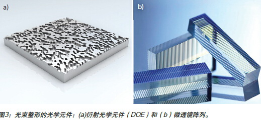 在衍射方法中, 衍射光學元件(DOE)定位在準直激光束的傳播路徑上。衍射光學元件表面的極小的結(jié)構(gòu)能按照預想的形狀和強度設置來衍射激光光束(圖3)。衍射方法的優(yōu)點在于可以修改激光光斑的大小和強度。此外,衍射光學元件不需光學對準。因此,可以容易、快速地通過更換衍射光學元件來改變焊縫寬度,而無需更改任何透鏡和工作距離。衍射技術(shù)的缺點是相比折射方法具有較高的光損耗,并且根據(jù)不同的要求,需要更高亮度的激光源——光纖激光器。