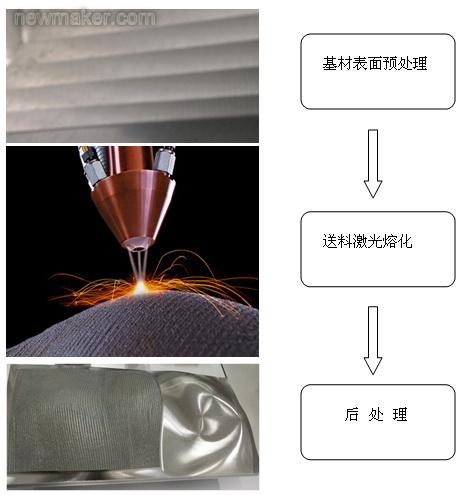 同步送粉式激光熔覆的主要工藝流程為:基材表面預(yù)處理---送料激光熔化---后處理,如下圖示: