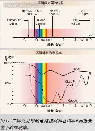 圖1中的圖表顯示了三種常見的PCB材料在六種不同激光器作用下的吸收率。這六種激光器中包括準分子激光器(波長為248 nm),紅外激光器(波長為1064 nm),和兩種CO2激光器(波長分別為9.4μm和10.6μm)。紫外激光器(Nd:YAG,波長為355nm)是一種罕見的在三種材料中吸收率一致的激光器。