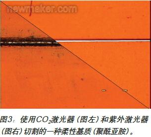 圖3展示了使用CO2激光器(圖左) 和紫外激光器(圖右)對同樣的柔性基質(聚酰亞胺)進行切割。使用高溫的CO2激光器比使用紫外激光器的炭化和沖緣加工效應大很多,如前所述,紫外激光器在冷消融工藝上占有優勢。