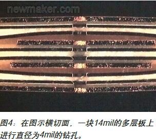 紫外激光器在進行多層鉆孔時尤為有用。多層PCB使用復合材料經熱壓鑄入在一起。這些所謂的“半固化”會發生分離,特別是在使用溫度更高的激光器加工后。但是,紫外激光器相對來說無應力的屬性就解決了這一問題,如圖4所示。在圖示橫切面,一塊14 mil的多層板上鉆直徑為4mil的孔。這一在柔性聚酰亞胺鍍銅基板上的應用,顯示了各層之間沒有出現分離。關于紫外激光器低應力屬性,還有重要一點:提高了成品率數據。成品率是從一塊嵌板上移除的可用電路板的百分率。