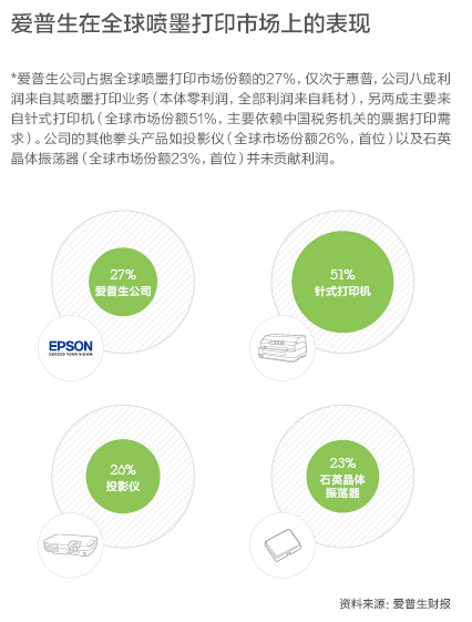 來自IDC的數據證明了他的決意。愛普生將重心放在噴墨上,而且嚴重依賴噴墨耗材帶來的收益。這家公司占據全球噴墨打印機市場份額的27%,僅次于惠普。公司也有八成利潤來源于噴墨打印生意,而占據全球份額首位的投影儀和石英晶體振蕩器并未貢獻利潤。