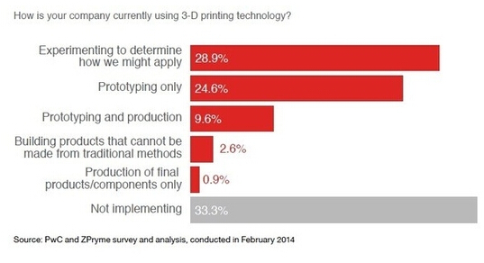 近日,位于倫敦的英國普華永道國際會計事務所(PWC)對一百家制造企業進行調查,并作了相關的分析報告。調查總結了之前3D打印技術的發展,以及對3D打印技術的發展做了幾個方面的推測。據PWC調查,發現超過三分之二的制造企業或多或少地采用了3D打印技術。