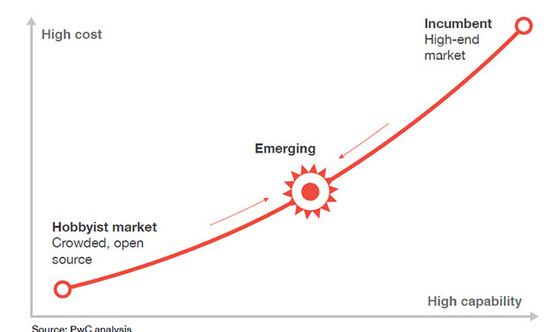 在實際制造應用中,有些在傳統制造(減材制造)無法完成時,才會采用3D打印技術;有些企業使用3D打印技術制作成品。企業使用3D打印技術制造的方式不同:有的在產品初期;有的在產品制成時。據PWC稱原型機制造是驅動3D打印技術被采用的原因,未來3D打印技術還是會廣泛用于原型機制造。據PWC調查顯示,新興的3D打印機市場將會被低成本、高質量重新定義。