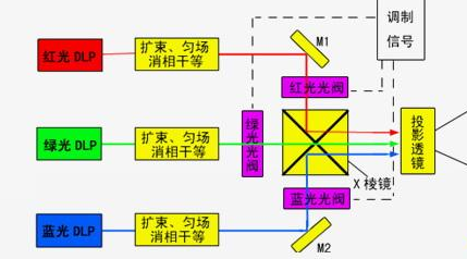 從形態(tài)上來說,最初的激光電視并不像現(xiàn)在這樣的采用主機和屏幕分離的形式,而是真真正正的一臺電視機。而技術上,它是由激光發(fā)射器、調(diào)制器、偏轉(zhuǎn)器和屏幕來組合成顯示系統(tǒng)。當系統(tǒng)接收到視頻信號后,分離成三色(紅、藍、綠)的圖像信號,經(jīng)過處理過控制三色的半導體激光二極管發(fā)射出相應強度的光。再經(jīng)過調(diào)制輸出和信號同步控制后通過光偏轉(zhuǎn)器的光束掃描到屏幕上形成圖像。