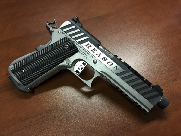 這次的3D打印金屬槍,在槍身上印制了一個單詞“REASON(理性)”,槍膛使用了10mm AUTO口徑,其外形比上一次更加時尚,槍把上打印有波浪式的圖案應該加便于抓握。此外在槍把的上方還印制了說明文字,讓人一目了然這件武器的生產信息,顯然,這款槍也是為武器收藏愛好者準備的。