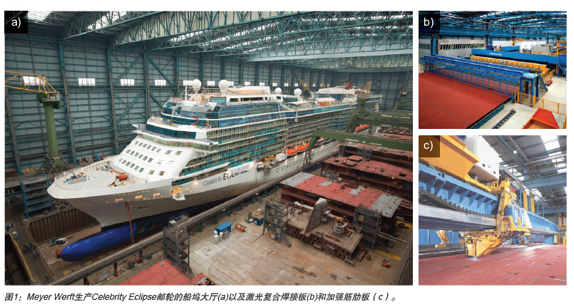位于德國Papenburg的Meyer Werft 船舶制造廠是始建于1795年的家族式企業。最初由制造捕魚和引航船到集裝箱運輸船和渡輪,然后轉變成郵輪(圖1)的頂尖制造商。他們有今天的成就, 與始終把不斷改進生產工藝作為發展的第一要務有必然關系。2000年,Meyer Werft成為第一家引進激光復合焊來制造板材的造船廠(長度高達20米),然后其他的歐洲船廠例如Fincantieri和Aker Finyards也緊隨其后采用這種方法。這一技術的使用極大縮短了生產時間(極高的焊接速度和焊縫深度),并降低了后續費用(較小的熱變形)。自從開始實施激光復合焊以來,這個行業的趨勢是朝著使用固體激光器加工更大幅的板材、更高的板材厚度的方向發展。為此,Meyer Werft船舶制造廠一直精心運營其具有頂尖研究實驗室的研發部門,并與研究機構例如德國亞琛工業大學ISF焊接和連接研究所(ISF Welding and Joining Institute)進行密切合作。激光復合焊已經成為Meyer Werft最重要的焊接技術(目前使用三臺碟片激光器和五臺CO2 激光器),他們最大的游輪(350米長、40米寬)的激光復合焊接接縫大約有450公里長,最大的板材尺寸是30×25米。