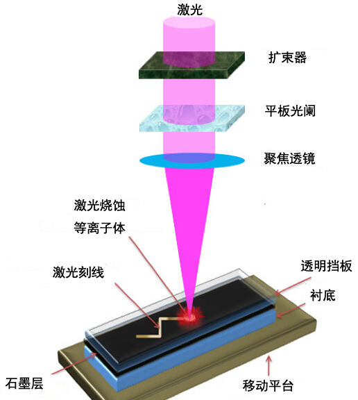 上圖描繪了一項新技術的工作原理,利用脈沖激光束將石墨合成納米金剛石薄膜并在石墨上進行光刻,該技術有望應用于傳感器及計算機芯片領域。 研究人員在提升金屬強度的實驗過程中有了意外收獲,他們利用脈沖激光束照射在石墨層,制備出了納米金剛石薄膜(nanodiamond films)并實現了光刻燒蝕。該技術在生物傳感器乃至計算機芯片領域有巨大的應用潛力。