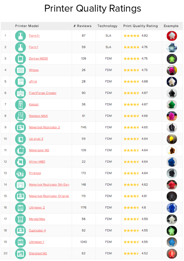 首先,在打印機(jī)質(zhì)量評(píng)級(jí)最高的桌面3D打印機(jī)中,F(xiàn)ormlabs公司的Form 1+和其前身Form1壟斷了前兩名,分別得到4.82和4.76分。有趣的是,這是排行榜上僅有的兩款SLA 3D打印機(jī)。而且Form1+已經(jīng)連續(xù)兩個(gè)月排名第一。