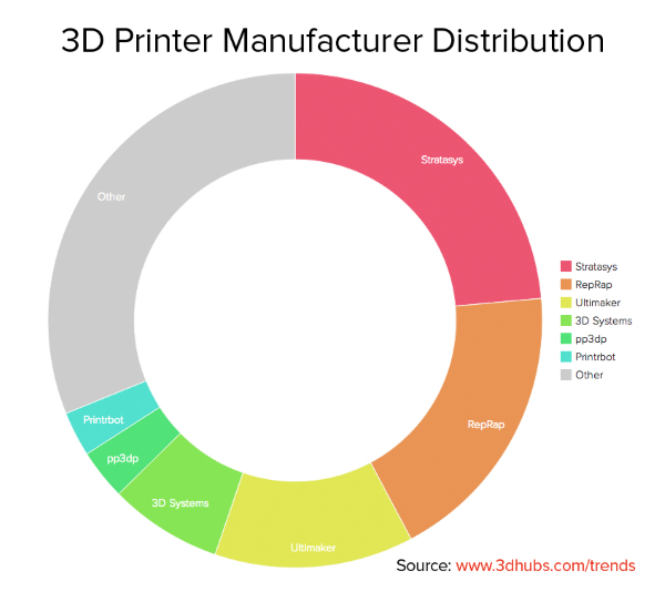 根據(jù)3D打印機(jī)制造商的市場占有率來看,Stratasys、RepRap和Ultimaker維持保持前三名,這三家的市場份額合計(jì)達(dá)55.2%。