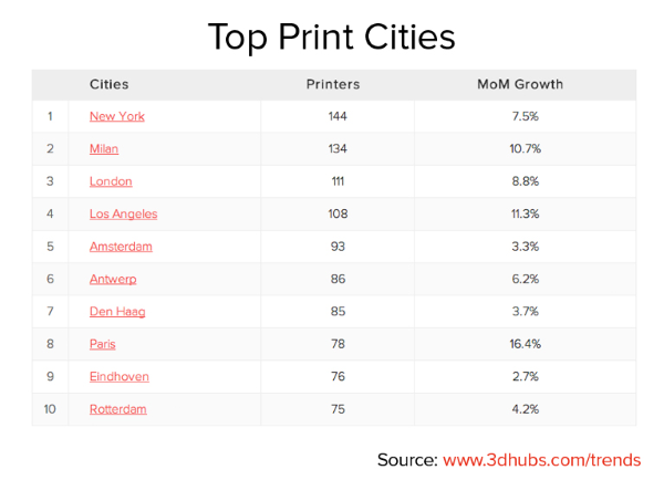從全球范圍來看,3D打印將繼續(xù)擴(kuò)大其覆蓋面。 紐約、米蘭、倫敦和洛杉磯仍然是擁有3D打印機(jī)數(shù)量最多的四家城市。與此同時(shí),阿姆斯特丹、海牙丹、埃因霍溫和鹿特丹則使荷蘭成為上榜城市最多的國家。