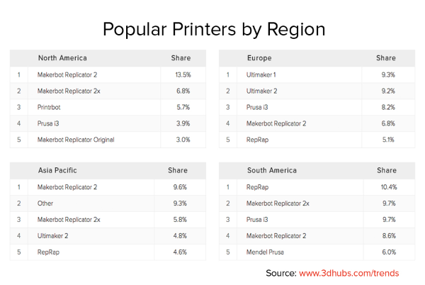 此外,3D Hub還按區(qū)域?qū)τ谝恍?D打印機(jī)品牌的市場占有率進(jìn)行了統(tǒng)計(jì)。這個(gè)數(shù)據(jù)沒有太大的改變:在歐洲,前兩名的是Ultimaker 1和2。同樣,在北美、亞太Markerbot Replicator 2和2X也高居榜首。