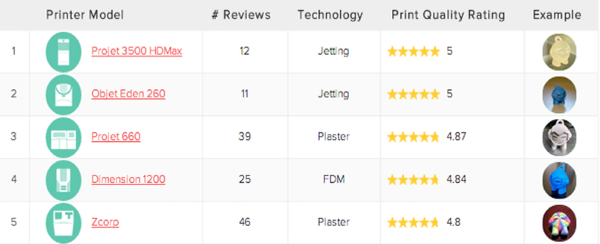 工業級3D打印機的評級榜上,Pojet 3500 HDMax、Objet Eden 260并列第一,并獲得滿分5星。在這里,SLS和噴射技術占據上風,而具有全彩打印能力的 Project 660和Zcorp分別獲得了第3和第5名。Dimension 1200是名單上唯一的FDM打印機,第4位。