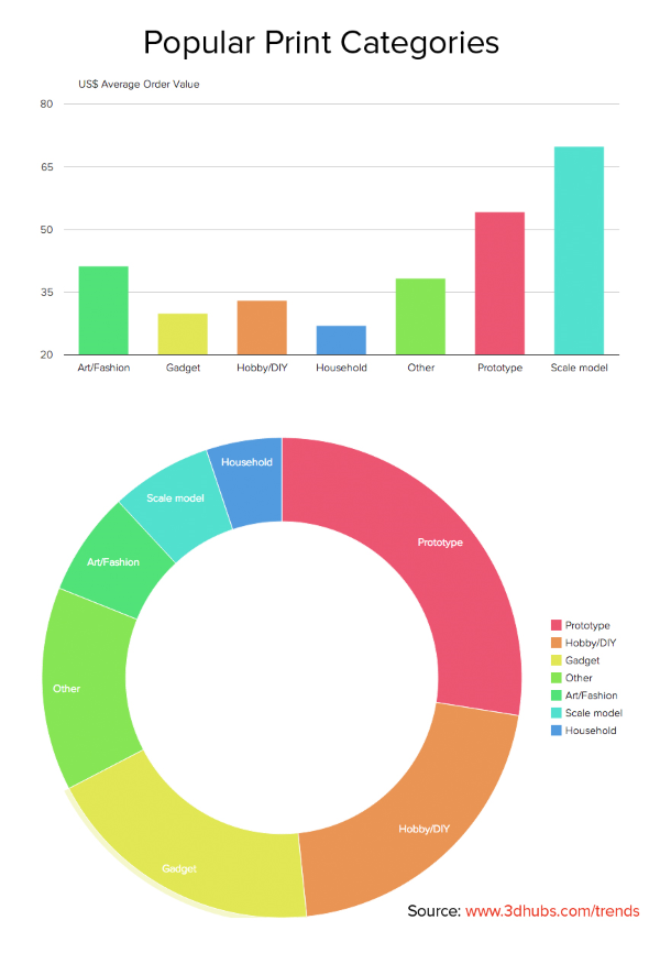 現在讓我們看看這些3D打印機主要被用于做什么吧!3D Hub的數據顯示,排在熱門打印類別前三的是原型、業余愛好/DIY和小工具,其中小工具類別增長得最快。該數據可能表明更多的低成本消費級對象正在打印,顯示DIY文化仍然是當前3D打印的核心。