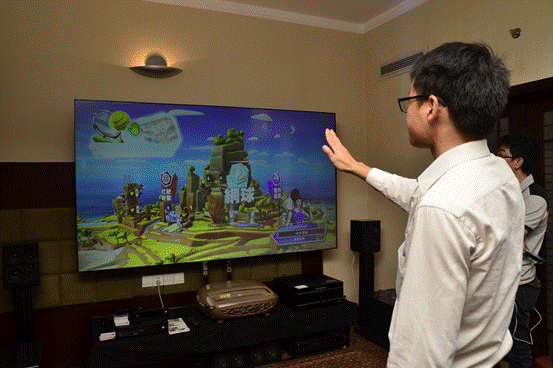 再看右手邊,卻是另一款奢品金智能激光電視。此處卻是逗留了更多觀眾,正在等待試玩體感游戲與智能操控上網沖浪。逐一而試,你會發(fā)現(xiàn),游戲的背景畫面與人物動作皆與你本身的現(xiàn)實人物動作是完全同步的,你的手部動作跨度越大,游戲中的人物動作也會隨之增大,反之真實人物的動作跨度越小,而游戲中的人物動作也隨之變小,真正達到人與游戲的完美契合。更讓人意外的是,在另一邊的智能操控上網沖浪體驗區(qū),你會發(fā)現(xiàn)觀眾們只需通過語音識別,便可以實現(xiàn)對電視的操控,真正達到人機互動,享受智能遙控最為輕松便捷的人性化體驗。