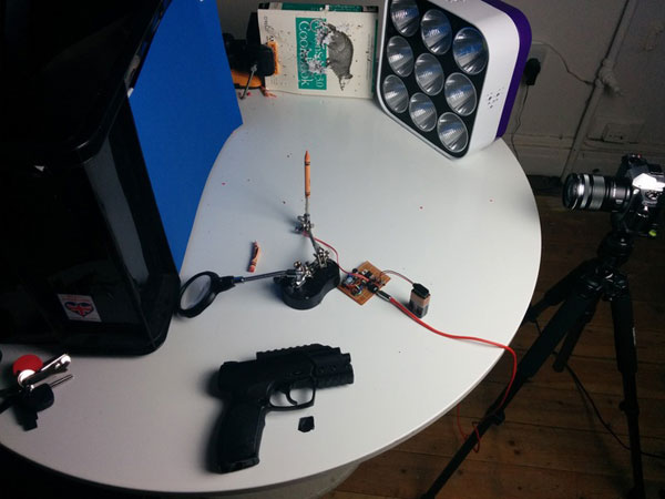 大家在網上可見到不少捕捉子彈射穿不同的水果、汽水瓶的相片,有沒有想過是如何拍攝呢?這些相片除了要用到感測聲音的快門觸發器之外,一般都會在較暗地方拍攝,利用閃光燈閃爍一刻凝固畫面,否則以子彈的速度,一般相機的1/8000秒快門都未必足以拍到清晰畫面。