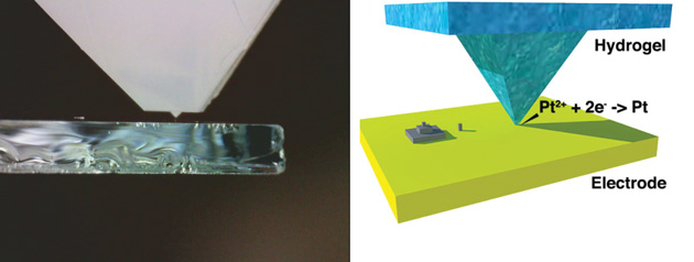水凝膠筆是借助于其頂端的金字塔形狀生成穩態電流,并形成比當前能夠達到的水平小得多的尺度。參與的科研團隊在其研究的最終形成了幾個結論: