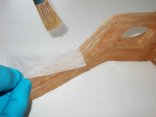 快速硬化材料在大約五分鐘開放時間內(nèi)被使用,因此這一步驟可以在不妨礙工作過程情況下被快速重復(fù)。兩種材料元件的混合被涂刷上核心部件,如果表面由于聚合作用變粘,應(yīng)用玻璃纖維組織并用刷子抹平。重復(fù)這些步驟,直到材料壁厚達到1毫米。