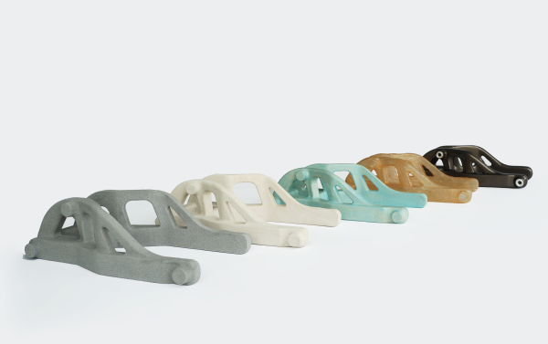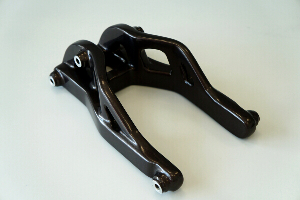 從左至右依次為:3D打印的核心部件;涂層的核心;藍色的第二層,疊層;沖洗出來的核心部件;噴色后帶金屬嵌件的摩托車搖搖桿#p#分頁標(biāo)題#e#