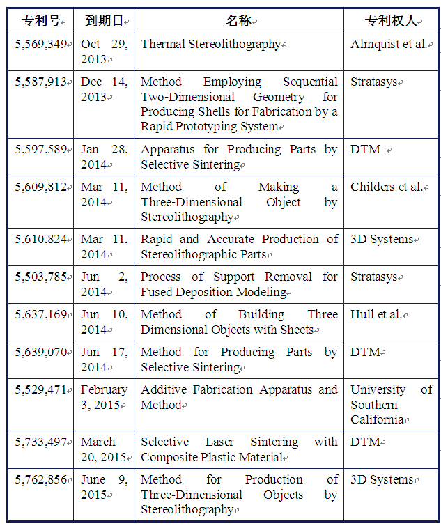 進(jìn)入2014年,對3D打印機(jī)發(fā)展有一個非常利好的消息是,F(xiàn)DM、SLA、SLS等十幾個3D打印的核心專利相繼到期,到2015也會有一些專利到期。