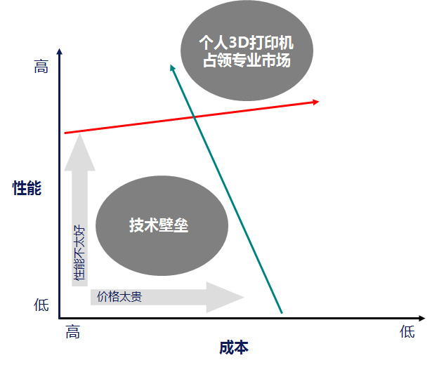 另外,從性價比上來看,專業(yè)的3D打印機(jī)價格在不斷地下降,性能也有所提升,從圖1上看,個人3D打印機(jī)從以前的幾百美元到現(xiàn)在的幾千美元,雖然價格在不斷地上升,但是它的性能上升得更快,所以在成本和性能交匯區(qū)域(圖1中左上方位置)個人3D打印機(jī)將會取代專業(yè)級3D打印機(jī)。