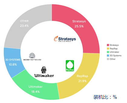 圖2 : 3D Hubs統(tǒng)計的裝機(jī)量按制造商分布情況