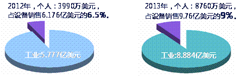 從圖6的餅圖可以看出來,在2012年,個人3D打印機(jī)的銷售額僅僅占增材制造設(shè)備銷售額的5.5%,但是在2013年占了9%。