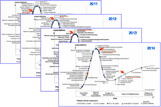 圖8 是Gartner于2011年、2012年、2013年和2014年的發(fā)布的新興技術(shù)成熟度曲線,可以看出3D打印在這個曲線上的情況,在2011年3D打印已經(jīng)開始進(jìn)入炒作的高峰期,2013年已接近定點,雖然在2014年還在高峰期內(nèi),但已經(jīng)過了頂點開始下滑,這一點應(yīng)該引起業(yè)界的注意,這是一個非常危險的事情。Gartner研究副總裁皮特•巴斯利爾(Pete Basiliere)表示:“消費類3D打印機(jī)獲得主流用戶的接受還需要5到10年時間”,與個人3D打印機(jī)不同的是,從剛發(fā)布的Gartner曲線來看,企業(yè)的3D打印已經(jīng)進(jìn)入了復(fù)蘇期,預(yù)計經(jīng)過2到5年的發(fā)展,它就會進(jìn)入到一個比較健康的發(fā)展平臺期。#p#分頁標(biāo)題#e#