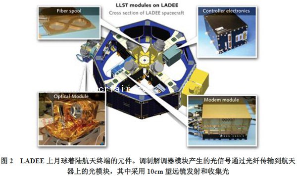 LLCD發射器是基于商業通信部件,包括分布反饋二極管激光器、摻鉺光纖放大器和調制器,避免空間定制激光器的高成本,美國宇航局光通信事業部總監Donald Cornwell說。設計、建造和運行由麻省理工學院的林肯實驗室完成,發射器通過10cm望遠鏡發射0.5W 1550nm波段激光,一個16進制脈沖位置調制編碼四位數據脈沖,在月球軌道的月球大氣與粉塵環境探測器(LADEE)(見圖2)運行速率622Mbit/s。為了最大限度提高靈敏度,地面接收器采用工作在1-3K的超導納米線陣列探測器。單個1550nm光子可以加熱4nm線足夠阻止超導,Cornwell說“這一靈敏度是很驚人的,檢測效率達到70%~80%”。