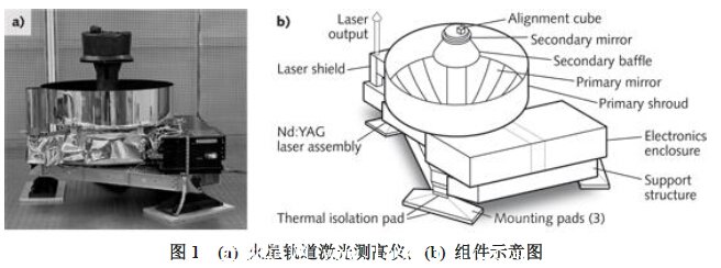 圖1所示為全新火星軌道激光測高儀,是專門為較小的后續火星探測任務 1996年發射的火星全球勘探者號制造的。這個任務獲得了巨大成功,從1998年3月到2001年6月,激光高度儀測量火星從南極到北極的海拔,形成了太陽系行星中最精確的全球地形圖。二極管泵浦、Q開關、Nd:YAG激光器每秒鐘發射十個48mJ脈沖,每束脈沖持續8ns。總共算下來,它發射了6.7億束脈沖,這一數據引自一份表述火星有冰川的最新報告。