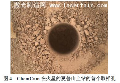 自2012年8月以來,好奇號火星車已經探測到火星土壤和巖石,通過一個稱為ChemCam 的儀器將30mJ激光脈沖持續5ns聚焦到一個亞毫米點上(見圖3)。它使用一個鉀鎢酸釓[Nd:KGd(WO4)2或Nd:KGW]摻釹棒,因為其廣泛的溫度范圍。激光脈沖燒蝕材料表面并進行激光誘導擊穿光譜(LIBS)上的斑點高達7m的距離。
